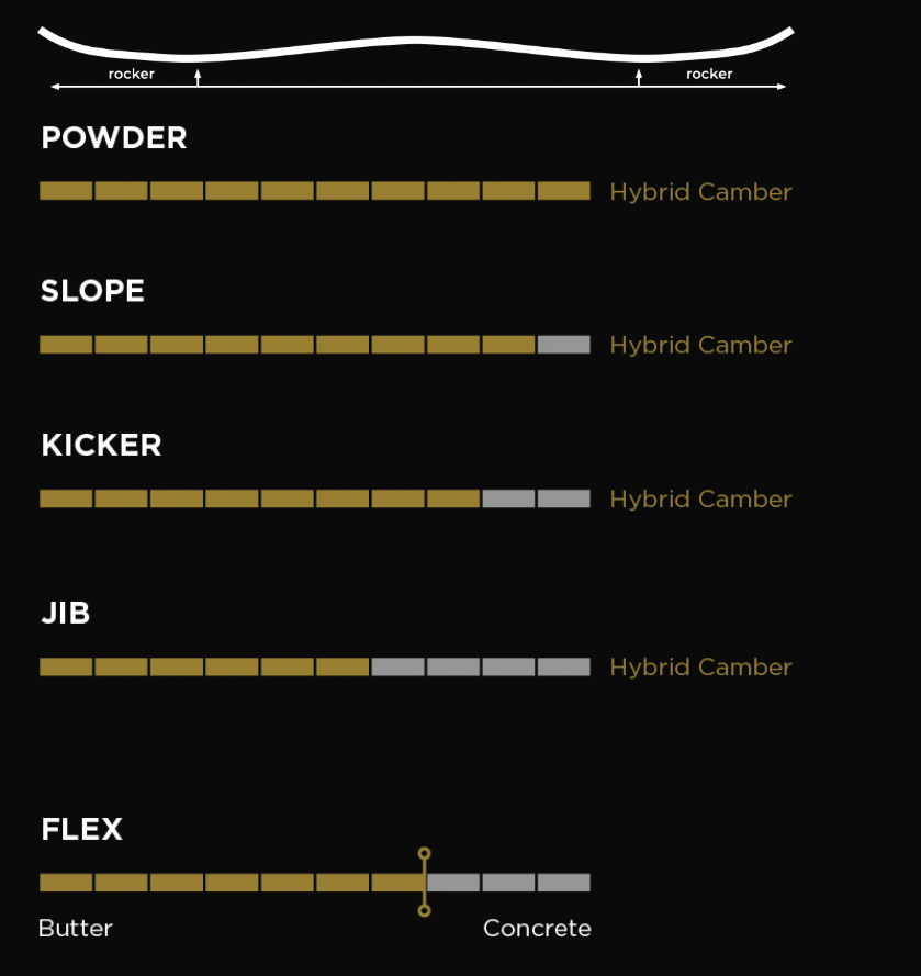 Butter Concrete - medium to medium-stiff: a unique blend of playfulness and backbone. Flexible enough to play and do butters, but firm enough to ride hard and punch landings.